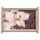 A serving tray a white phalaenopsis orchid close up photograph has been softened and digitally altered with a collage of words ~ floral, orchid and blossom. Use as a serving tray or simple a design feature. Click the Customize it! button to add text in a font, style, size and color you like.