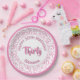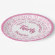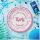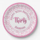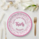 This design is a pink and white random number pattern with milestone number 30 repeated in varied sizes and angles. Your text is printed on the white circle in the center. The design is trimmed with white and pink rings around the rim.