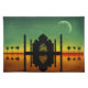 Orient night illustration: A mosque and palms silhouette on a night sky background with the moon and stars reflecting on water.