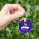 A trippy cool unique and personalized keychain with a typography design containing a rainbow peace sign with fingers raised up in a V. Text says 100% groovy in a funky font. Psychedelic hippie theme design. Set on a dark toned acid purple color background.