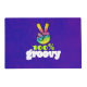 Trippy cool placemats with a typography design containing a rainbow peace sign with fingers raised up in a V. Text says 100% groovy in a funky font. Psychedelic hippie theme design. Set on a dark toned acid purple color background.