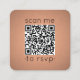 Simplify RSVP responses and provide any important details with chic modern QR code square enclosure cards. All text is simple to customize, including wording that reads "scan me to rsvp". To make your own QR code using the generator, simply type the website URL into the template. By scanning the card with their phones, guests are sent directly to the wedding website to reply to the invitation. An online rsvp process reduces the chance that cards will be lost in the mail. It's also more versatile, in that you can ask for more detailed information, such as meal choices, food allergies, and song requests. All response information can be personalized or deleted. The copper orange and black design features a faux foil background and elegant modern typography. Please note that copper is printed color, not metallic foil. This card is a stylish way of asking wedding guests to kindly reply to your upcoming special day celebration.