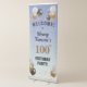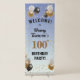 A 100th Special Age Birthday Party Banner (age can be changed to: 60, 65, 70, 80, 85, 90, 95, 100 etc), designed with gold, black and white balloons on a two toned blued background, and text: Welcome, First and Last Name, Age and Birthday Party Celebration. To personalize, simply insert your text into our easy template, replacing the sample text.