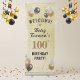A 100th Birthday Party Welcome Banner designed with gold, black and white balloons and gold colored confetti accents to celebrate a special someone on their extra special birthday. The text includes: Welcome To, The First and Last Name, The Age, and Birthday Party. To personalize this Retractable Banner simply insert your text into our easy template, replacing the sample text. Note: The number 100 can also be changed to a different age.