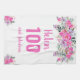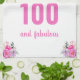 Elegant design for a 100th birthday party with a pink "100 and fabulous" and a scripted name embellished by a feminine watercolor flowers on a white background. Customize age, text, name and background color.