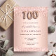 A modern, stylish and glamorous invitation for a 100th birthday party. A rose gold background with drips. The name is written with a modern dark rose gold colored hand lettered style script. Personalize and add your party details. Number 100 is written with a balloon style font, script.