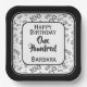 This over-the-hill design has a black and white random number pattern with the centennial milestone number 100 repeated in varied sizes and angles. There is a white rounded square in the center for your text and black and white around the rim.