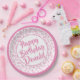 This modern over-the-hill design has a pink and white random number pattern with a pink milestone number 100 repeated in varied sizes and angles over a white background. There is a white circle in the center for your text and pink-and-white rings around the rim.