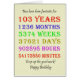 103rd birthday card counting down the years, days, months, hours, and minutes. A card to give pause for thought! Leap years have been taken into account!