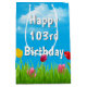 Colorful spring tulips in grass with sky background for 103rd birthday.
