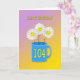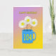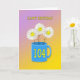 Happy smiling daisy flowers in a bright blue mug, The age 104 is in yellow on the mug. A lovely way to wish a happy 104th birthday.