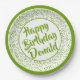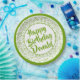 This modern over-the-hill design has a green and white random number pattern with a green milestone number 105 repeated in varied sizes and angles over a white background. There is a white circle in the center for your text and green-and-white rings around the rim.