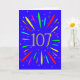An explosive 107th birthday card! What a wonderful way to send birthday greetings. The number 107 in bright yellow with an explosion of bright colors and stars.