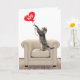 Tabby cat standing on a leather chair playing with a red heart balloon for 109th birthday.