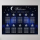 A 10 tables wedding seating chart for a celestial wedding theme, with the moon and star on a starry night blue background. The table numbers are written in big silvery gray stars. The moon, the stars and the word Welcome (written in an elegant calligraphic script) are silvery gray, the rest of the text is white.