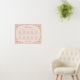 It has a vintage frame with (faux) rose gold decorations in the corners. In the upper part, there is the word Welcome, written in a big elegant calligraphic script. The names of the bride and groom are written in the same calligraphy, but smaller, near the lower border. The rest of the text is in caps. The background is blush pink, all text is has a color similar to the rose gold frame .