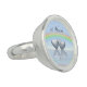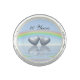 A ring with my image of two tin or aluminum hearts floating on the water under a rainbow. Customizable text says "10 Years".