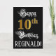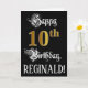 The front of this ornate and opulent birthday-themed greeting card design features the message “Happy 10th Birthday,”, and a custom recipient name. Part of the message is in an elaborate script-style text. The large number “10th” features a faux/imitation gold-inspired look pattern. The background is colored black. The inside has a personalized birthday greeting message, or could perhaps be cleared and left blank if a message is to be written by hand instead. An elegant, customized birthday greeting card like this might be used to celebrate somebody’s tenth birthday. [~Z0000559]