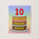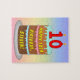This cheerful and joyful birthday jigsaw puzzle design features a cartoon-style depiction of a three-tier birthday cake having number-shaped candles on top showing the age “10“, along with the message “HAPPY 10TH BIRTHDAY,”, and a personalized recipient name. The background has a multi-color pastel rainbow spectrum inspired gradient pattern. An upbeat, editable birthday puzzle like this might be used to celebrate somebody’s tenth birthday. [~Z0000621]
