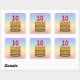 This upbeat and joyful birthday themed square sticker design features a cartoon-style depiction of a three-tier birthday cake having number-shaped candles on top showing the age “10“, along with the message “HAPPY 10TH BIRTHDAY,”, and a custom recipient name. The background has a multi-color pastel rainbow spectrum inspired gradient pattern. Birthday themed stickers like these might be used or distributed at a party celebrating somebody’s 10th birthday, or perhaps used when preparing invitations or wrapping presents/gifts for such an event. [~Z0000624]