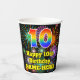 This joyful and fun birthday themed paper cup design features a large number “10” having a rainbow spectrum gradient inspired pattern. It also features the message “Happy 10th Birthday,”, and a customizable name. The background features a colorful pattern inspired by the look of bursting celebratory fireworks. Colorful, vibrant paper cups like this might be fun to use at a birthday celebration/party being held to honor somebody’s tenth birthday. [~Z0000539]