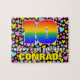 This exciting and colorful birthday jigsaw puzzle design features a large number “10” with a multicolored rainbow spectrum inspired gradient pattern, along with the message “HAPPY 10th BIRTHDAY,”, and an editable recipient name. The background has a cheerful pattern of loving heart shapes of various sizes and colors. An eye-catching, customized birthday puzzle like this might be a fun way to deliver birthday wishes to somebody who is celebrating their tenth birthday. [~Z0000611]