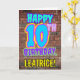 The front of this fun birthday greeting card design features the message “HAPPY 10TH BIRTHDAY,” having a colorful, vibrant, graffiti-inspired look, along with a custom recipient name. The background of the front features a brick wall inspired pattern. The inside has a customized birthday greeting message, or could perhaps be cleared and left blank if a message is to be written by hand instead. A fun, customizable birthday greeting card like this might be used to celebrate somebody’s tenth birthday. [~Z0000531]