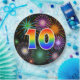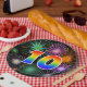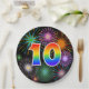 This fun, cheerful, and colorful paper plate design features a large number "10" having a rainbow spectrum gradient inspired pattern coloring. It also features a vibrant and exciting bursting celebratory fireworks inspired pattern. The background is colored black. Fun paper plates like this might be used at a celebration being held in honor of somebody’s tenth birthday, a tenth anniversary, or some other 10th event. [~Z0000490]