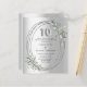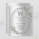 A faux silver looking background. Decorated with greenery and an oval frame. Personalize and add a name and details. Number 10 is written with a faux silver looking balloon style font.