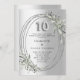 A faux silver looking background. Decorated with greenery and an oval frame. Personalize and add a name and details. Number 10 is written with a faux silver looking balloon style font.