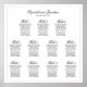 This beautiful 11 table seating chart will add beauty, style, and grace to your wedding reception. The simple yet elegant black and white design includes fancy script lettering for both the couple's names and table numbers with the traditional 10 seats per table. The timeless classic design will make it easy for your guests to find their tables, while adding a stylish touch to your event.