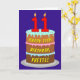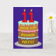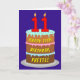This fun and upbeat birthday greeting card design features a depiction of a three-tier birthday cake having number-shaped candles on top showing the age “11“, along with the message “HAPPY 11TH BIRTHDAY,”, and a custom recipient name. The inside features a customizable birthday greeting message, or could perhaps be cleared and left blank if a message is to be written by hand instead. A joyful, personalized birthday greeting card like this might be sent in celebration of somebody’s eleventh birthday. [~Z0000620]
