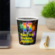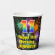 This colorful and exciting birthday paper cup design features a large number “11” having a rainbow spectrum gradient inspired pattern. It also features the message “Happy 11th Birthday,”, and a personalized name. The background features a vibrant and colorful pattern inspired by bursting celebratory fireworks. Colorful, vibrant paper cups like this might be fun to have at a birthday celebration being held in celebration of somebody’s eleventh birthday. [~Z0000539]