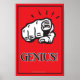 Black & White on red backrground retro illustration of finger pointing toward viewer with the word GENIUS beneath it.