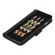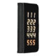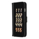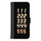 Black iphone wallet case with repeating numbers 111,222,333,444,555 from an alarm clock in orange.