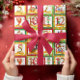 This adorable Christmas wrapping paper features 1 partridge in a pear tree, 2 turtle doves, 3 french hens, 4 calling birds, 5 golden rings, 6 geese a laying, 7 swans swimming, 8 maids milking, 9 ladies dancing, 10 lords leaping, 11 pipers piping and 12 drummers drumming each in a decorative frame. Perfect for wrapping those holiday gifts.