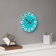A stylish clock face with the numbers placed inside circular color spots in each hour position. Also available in other colors.