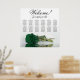 This wedding seating chart has 12 tables and boasts a romantic, elegant, and beautiful design. A modern floral arrangement is accented by a single, long-stemmed deep emerald green colored rose lying on its side, reflecting in a pool of water. The title, "Welcome! please find your table," is written in fancy script calligraphy, while the names of the couple and the wedding date are displayed at the bottom. With table assignments for 120 guests and 10 seats per table, this chart provides ample seating arrangements for your guests to enjoy the celebration.
