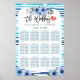 12 Tables Wedding Seating Chart Poster Templates - Elegant Script Watercolor Floral with Blue Brush Wave Stripes.