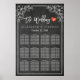 12 Tables Wedding Seating Chart Poster Templates - Elegant Script and White Floral Frame on Grunge Black Chalkboard Background.