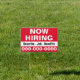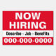 Are you hiring and want to get the word out on the street? This 12" x 18" double-sided, "Now Hiring" yard sign with a job description line and phone number, is fully customizable! Quantity discounts are available when you buy 6 or more of the same sign!