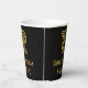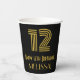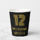 This vintage look and Roaring Twenties inspired birthday-themed paper cup design features a large art deco inspired appearance number “12”, plus the birthday greeting message “Happy 12th Birthday,” and an editable name. The background is colored black. Paper cups like this might be used at a birthday party for somebody who is celebrating their 12th birthday. [~Z0000546]