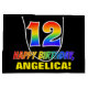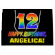 This colorful, fun, and cheerful birthday themed gift bag design features a large number "12" and the message "HAPPY BIRTHDAY,", both colored with a rainbow spectrum gradient inspired pattern, along with a bold yellow personalized recipient name. The background is colored black. A fun gift bag like this might be used when wrapping presents being given to somebody in celebration of their 12th birthday. [~Z0000477]