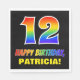 This fun, colorful, and cheerful birthday-themed paper napkin design features a large number "12" and the message "HAPPY BIRTHDAY,", both colored with a rainbow spectrum gradient inspired pattern, along with a bold yellow customizable recipient name. The background is colored black. Birthday themed paper napkins like this might be fun to use at a celebration being held to honor somebody who is celebrating their twelfth birthday. [~Z0000476]