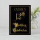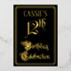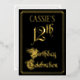 The front of this elegant, fancy, foil twelfth birthday party/celebration invitation design features the message “12th Birthday Celebration” in luxurious script-style text. It also has an editable name. The background of the front is colored black by default (although it can be customized to a different color). The back features personalized details about the event, such as the date, time, location, and any other information that may be relevant. Ornate, opulent, customizable invitations like these might be used to invite guests to a birthday party being held in celebration of somebody’s twelfth birthday. [~Z0000589]