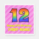 This cheerful and festive 12th birthday themed paper napkin design features a large number "12" having a colorful pattern inspired by the look of a rainbow spectrum. It also features the message "Happy 12th Birthday,", followed by a personalized name. The background features a dark pink and light pink stripes pattern containing loving pink heart shapes. Birthday themed paper napkins like this might be used at a party celebrating somebody’s 12th birthday. [~Z0000417]