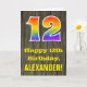 The front of this colorful yet rustic birthday greeting card design features a large number "12" having a rainbow spectrum gradient inspired pattern. It also features the message "Happy 12th Birthday,", and a customizable recipient name. The background of the front of the card features a rustic faux wood grain look pattern. The inside features an editable birthday greeting message, or could perhaps be cleared and left blank if a message is to be written by hand instead. A personalized birthday card like this might be a fun way to acknowledge somebody’s twelfth birthday. [~Z0000419]