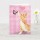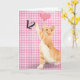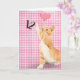 Gold tabby cat with pink heart balloon for 12th birthday on pink and white gingham background.