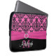 This chic and trendy personalized black, white, and hot pink damask pattern laptop sleeve with a PRINTED ribbon and PRINTED jewel brooch has text boxes for you to customize with your own name, monogram, business name, or other text. ****IF you would like the larger 15" size, please email me to make it up, as selecting the larger or smaller size will cause the design and text to shift. If you need any help customizing, please email niteowlstudio@gmail.com.