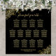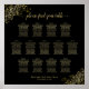 This beautiful 13 table wedding seating chart includes table assignments for 130 guests with 10 seats per table. The design features gold text on a black background with a lacy script calligraphy title. The corners are decorated with a frilly faux foil filigree with curls and swirls making it both simple and elegant. Stylish, chic and sophisticated way to help your guests find their seats at your reception.